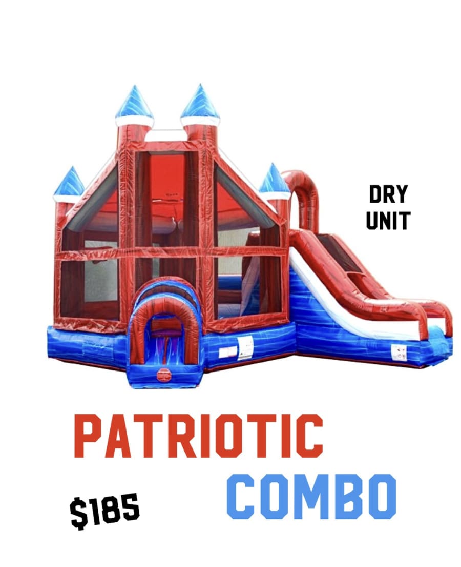 Imagine being a child and arriving at a party seeing the 16ft tall Patriotic Combo! This is equipped with a bouncing area and a slide for all of the kiddos to have a blast on! With it tall castle spires, spacious bouncing are, bright, vibrant colors and oh yea, did I mention the slide?!?! This is a unique adaption to the standard bounce house. This unit is a diamond shaped red white and blue unit that is capable of providing endless fun! This is a wonderful addition to all children's parties, and events with its gender-neutral colors! And let's not forget Memorial Day, 4th of July and Labor Day!!!