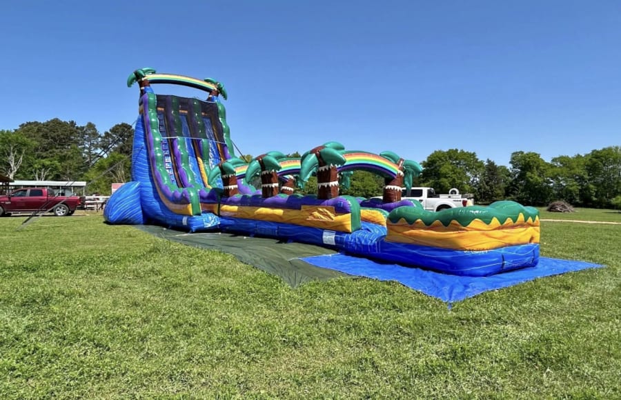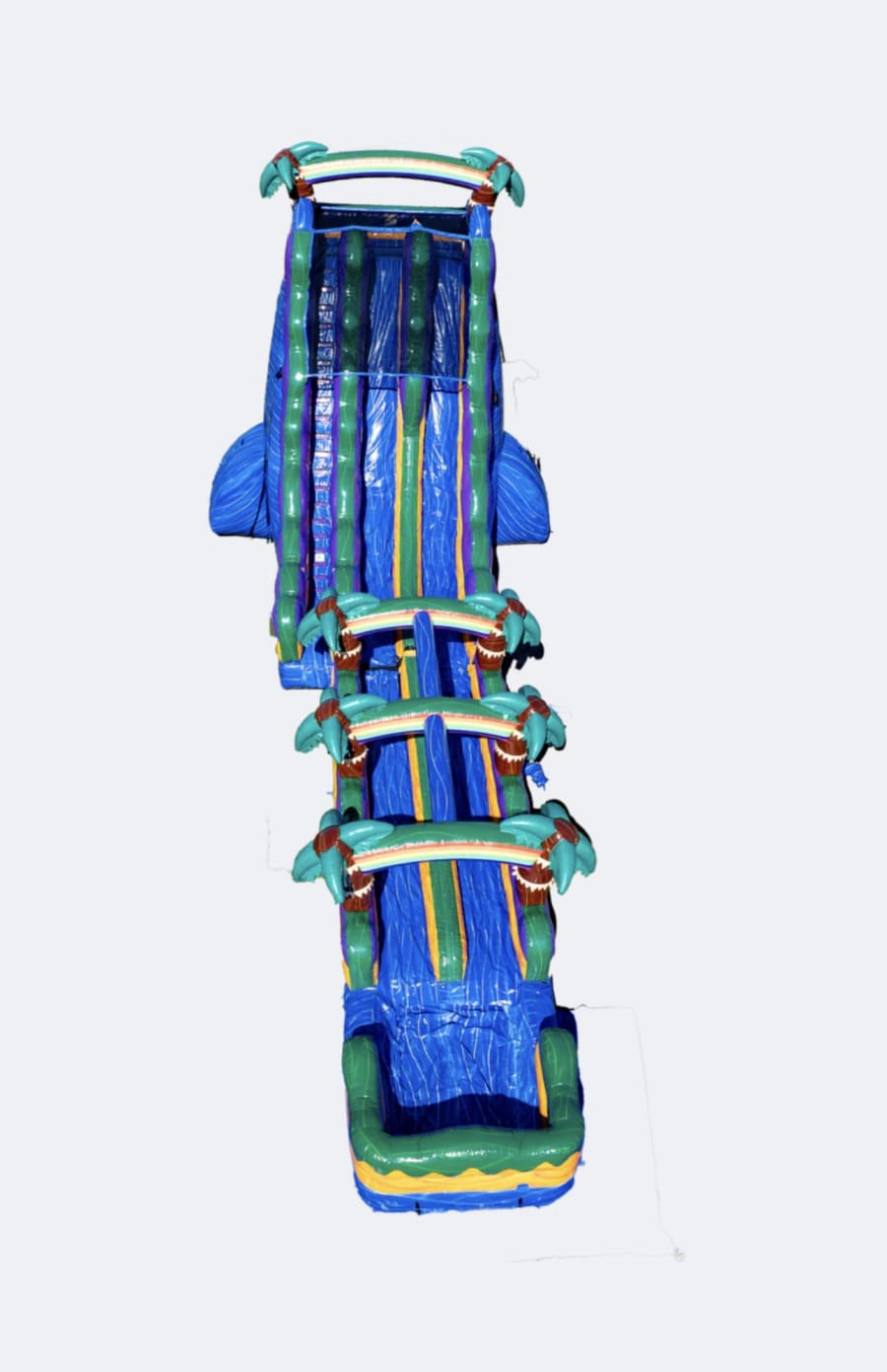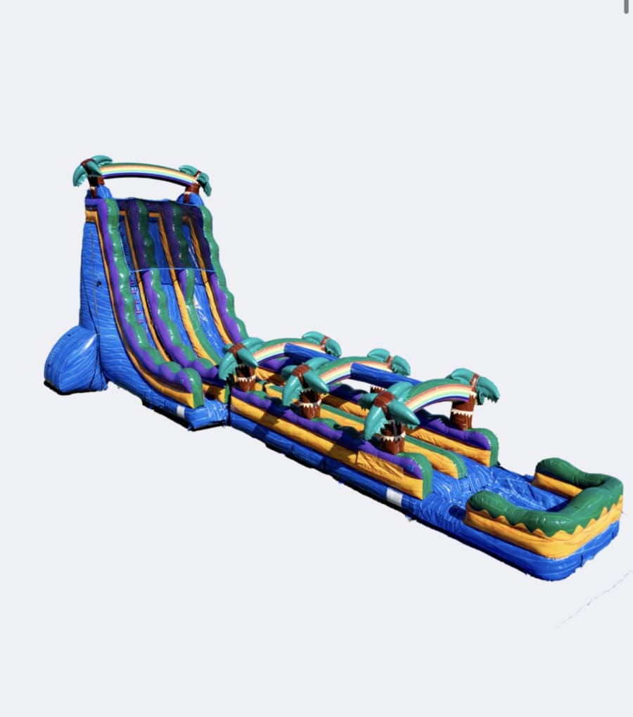 Get ready to make a splash with The Big Kahuna—our most epic inflatable water slide yet! Towering at a jaw-dropping 27 feet tall and stretching a wild 63 feet long, this tropical beast is built for thrill-seekers of all ages. With vibrant palm trees, rainbow arches, and a long splash runway, it’s like your own personal island getaway… with way more adrenaline!